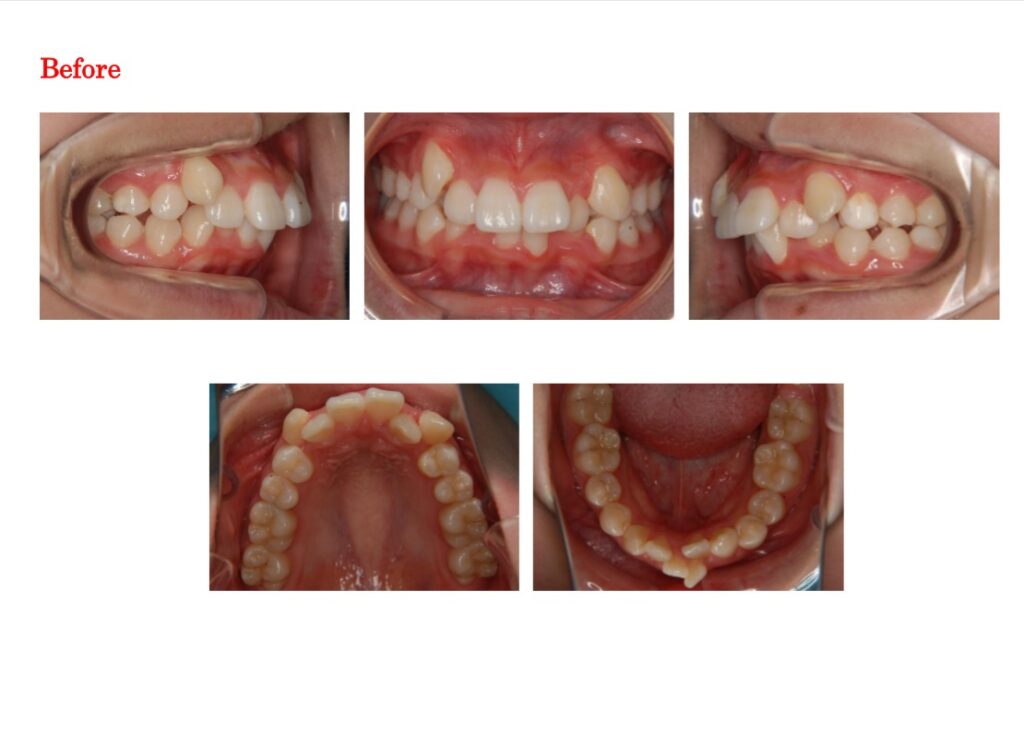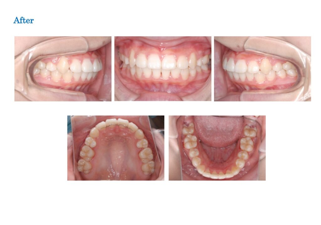 ●治療方法:上顎左右第一小臼歯を抜歯し、表側マルチブラケット装置と、上下顎固定式拡大装置を用いて治療しました。舌習癖があるので、MFT(筋機能訓練)を同時に行っています。