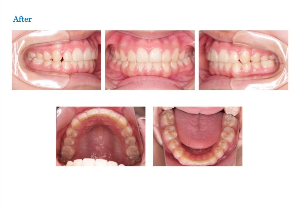 ●治療方法:表側マルチブラケット装置と、上顎固定式拡大装置を用いて治療しました。下顎の正中は下顎左側中切歯の中央で仕上げています。舌習癖があるので、MFT(筋機能訓練)を同時に行っています。